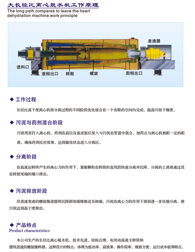 污泥離心脫水處理成套裝置(臥螺離心機),全稱:臥式螺旋卸料沉降離心機,是城市生活污水處理、自來水生產(chǎn)過程中的污泥處理、工農(nóng)業(yè)污水處理工程中的重要設(shè)備。