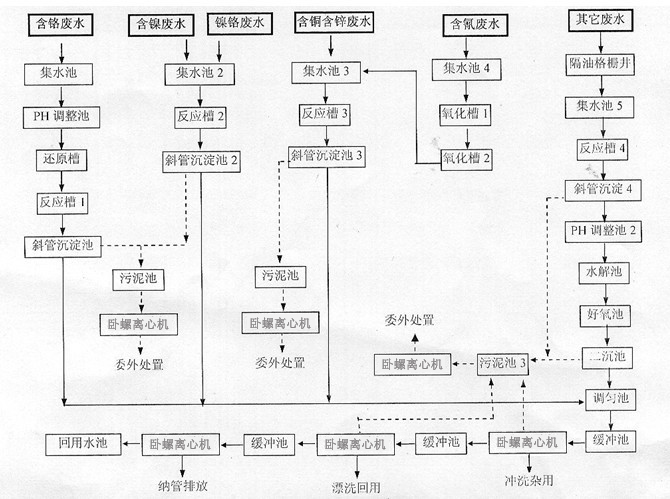 電鍍廢水治理工藝到現(xiàn)在已有很多成熟的工藝了,在廢水治理中為中國環(huán)保作出了很大的貢獻(xiàn)。常規(guī)的工藝是廢水分類治理,如將含氰廢水、六價(jià)鉻廢水分開預(yù)處理,將含氰廢水中的氰化物氧化、將六價(jià)鉻先還原成三價(jià)鉻,然后混合處理。這樣的好處在于有鐘對(duì)性地進(jìn)行處理,效果比較好,但由于廢水要分類,最終造成投資增加。在長(zhǎng)期和電鍍企業(yè)廢水治理單位的合作中,我們發(fā)現(xiàn)一個(gè)非常常見的問題,就是廢水很難分清楚。在實(shí)際生產(chǎn)過程中,要把各類廢水分得很清楚是非常困難的。往往是綜合廢水中各種成分的廢水都有,特別是化學(xué)鍍工藝廢水中有很多是絡(luò)合劑,和重金屬絡(luò)合后在水中非常穩(wěn)定。