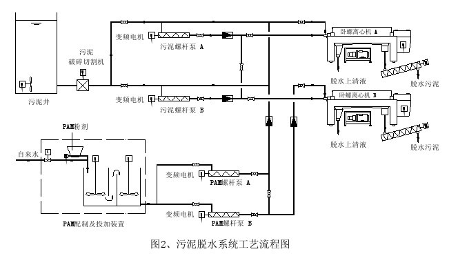 NOXON 臥螺離心脫水機(jī)的整體集成性能優(yōu)良,絮凝劑投加裝置、絮凝劑泵、污泥泵等均隨離心機(jī)配套供應(yīng),在自控系統(tǒng)的支持下,組成了一個(gè)有機(jī)整體,其工藝流程如圖 2 所示。