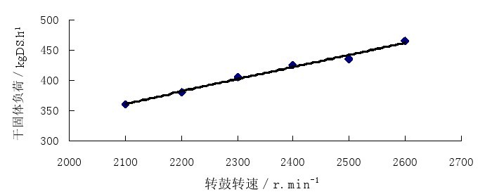 所謂干固體負(fù)荷是指每小時(shí)處理的不揮發(fā)固體重量,以 KgDS(干污泥)/h 表示。調(diào)整離心機(jī)的干固體負(fù)荷,對污泥脫水效果有很大影響,當(dāng)進(jìn)泥流量(即“水力負(fù)荷”)達(dá)到一定程度,所帶入的懸浮物含量超過了離心機(jī)所能承受的最大干固體負(fù)荷時(shí),會(huì)造成泥餅含水率增加,上清液帶泥增多,此時(shí)應(yīng)該減少進(jìn)泥流量,使離心機(jī)脫出的上清液清澈在實(shí)際運(yùn)行中,必須通過調(diào)整水力負(fù)荷,來保證進(jìn)入離心機(jī)干固體負(fù)荷不超過離心機(jī)的最大承受能力,否則,多余的干固體將從上清液中排出,上清液的懸浮物會(huì)急劇增多,但脫水泥餅的產(chǎn)量并沒有增加。該廠使用的離心機(jī),當(dāng)轉(zhuǎn)鼓轉(zhuǎn)速為 2300rpm、進(jìn)泥濃度為 35 g/L 時(shí),離心機(jī)運(yùn)行的干固體負(fù)荷可達(dá) 405kg/h。當(dāng)離心機(jī)磚鼓轉(zhuǎn)速增加時(shí),干固體負(fù)荷也會(huì)相應(yīng)增加,圖 3 是最大干固體負(fù)荷隨離心機(jī)轉(zhuǎn)鼓轉(zhuǎn)速變化的曲線。
