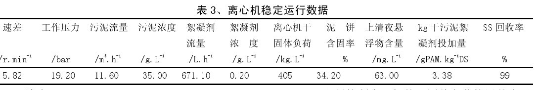 具體操作時(shí),初始階段,按每公斤干污泥投加 6克 PAM 的投藥量,在保持絮凝劑投加量固定不變的前提下,通過調(diào)整污泥螺桿泵的轉(zhuǎn)速,按最大流量進(jìn)泥,從低到高逐漸提高速差,直至上清也完全清澈,如果速差已經(jīng)提高到 7 r/min 以上,上清液的懸浮物含量仍然較多,說明進(jìn)泥量已超過離心機(jī)的最大干固體負(fù)荷,此時(shí)按 100%、90%、80%、70%、60%、50%、40%的梯度逐漸降低進(jìn)泥流量,直到出現(xiàn)良好的上清夜;經(jīng)過上述調(diào)整,待離心機(jī)運(yùn)行穩(wěn)定后,逐漸降低絮凝劑的投加量,直至在最少的 PAM 的投藥量情況下,都能獲得良好的泥餅含固率和上清液含固率為止。離心機(jī)穩(wěn)定運(yùn)行時(shí)的數(shù)據(jù)見表 3。