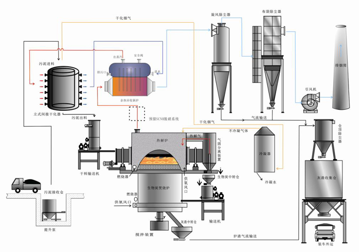 3、污泥進(jìn)入熱解爐進(jìn)行熱解,熱解后生物炭進(jìn)入生物炭焚燒爐提取可用熱量,混合氣進(jìn)入熱解爐膛燃燒,從熱解爐引來的燃燒后熱煙氣進(jìn)入余熱回收裝置,產(chǎn)生蒸汽迅速返回至間接干化器夾層,通過間接加熱對污泥進(jìn)行干化,干化后蒸汽變?yōu)闊崴赜?,引風(fēng)機抽出的煙氣經(jīng)尾氣處理系統(tǒng)清潔凈化后,達(dá)標(biāo)排放;