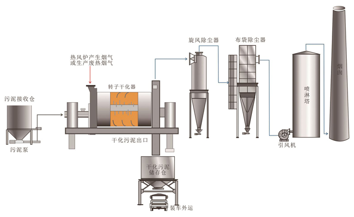 2.脫水污泥被輸送至轉(zhuǎn)子干化器,通過直接與熱煙氣接觸,在干化器內(nèi)實現(xiàn)加熱和干化;經(jīng)干化后的物料進入干化污泥儲存?zhèn)}后外運再利用;